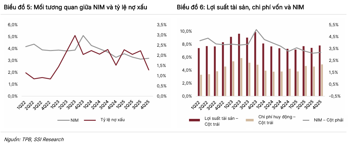 - NIM & chất lượng tài sản: NIM duy trì ổn định quanh 3.07% năm 2026 nhờ huy động vốn mạnh từ cuối 2025. Tỷ lệ nợ xấu giảm từ 2.23% (Q3/2025) → 1.29% (Q4/2025), tỷ lệ bao phủ nợ xấu cải thiện lên 92.7%, mục tiêu duy trì >100% để đảm bảo an toàn.