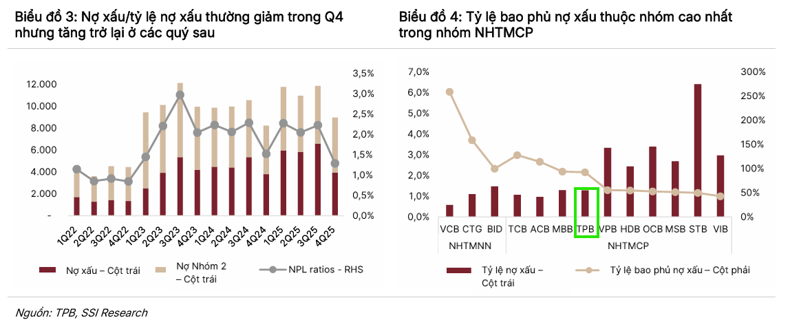 Theo SSI Research, TPBank sở hữu các chỉ tiêu chất lượng tài sản tương đối tốt so với các ngân hàng vừa và nhỏ khác nhờ đẩy mạnh xử lý và tái cơ cấu nợ. Mặc dù đối mặt với một số rủi ro như chi phí tín dụng tăng hoặc tỷ lệ hình thành nợ xấu cao hơn dự kiến, ngân hàng vẫn duy trì mục tiêu tỷ lệ bao phủ nợ xấu trên 100% để đảm bảo an toàn hệ thống.
