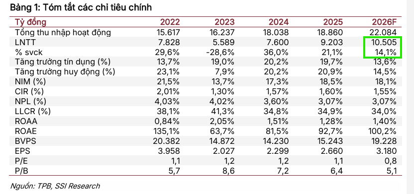 Trong năm 2026, lợi nhuận trước thuế của TPBank được dự báo sẽ đạt mức 10,500 tỷ đồng, tăng 14% so với năm 2025. Tăng trưởng tín dụng được kỳ vọng duy trì ở mức vừa phải khoảng 13.6% để thích ứng với khả năng hấp thụ của thị trường trong môi trường lãi suất có xu hướng tăng.