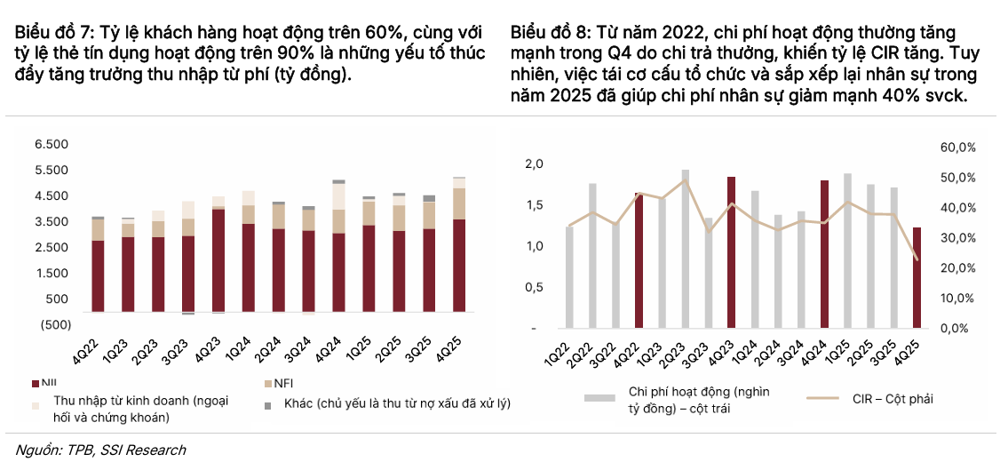 Kết quả & triển vọng tài chính: Lợi nhuận trước thuế 2025 đạt 9,200 tỷ đồng (+19.7% tín dụng), riêng Q4/2025 đạt kỷ lục 3,200 tỷ đồng (+47.7% YoY). Dự báo 2026 lợi nhuận trước thuế 10,500 tỷ đồng (+14% YoY), tăng trưởng tín dụng 13.6%, thu nhập phí +16.3% YoY.