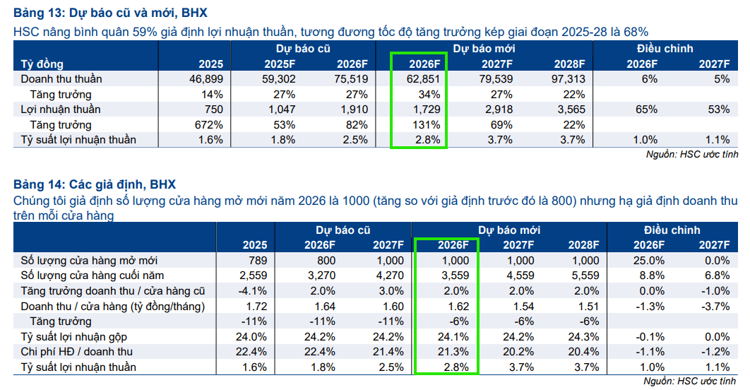 Về Bách Hóa Xanh, HSC tăng bình quân 6% và 59% dự báo doanh thu thuần và lợi nhuận thuần của BHX cho các năm 2026-2027 và đưa ra dự báo lần đầu cho năm 2028. Trong các năm 2026 và 2027, HSC kỳ vọng BHX sẽ ghi nhận lợi nhuận thuần lần lượt 1,729 tỷ đồng và 2,919 tỷ đồng, đóng góp lần lượt 20% và 26% vào lợi nhuận thuần của MWG. Dự báo mới cho thấy lợi nhuận thuần tăng trưởng với tốc độ CAGR 3 năm đạt 68%.