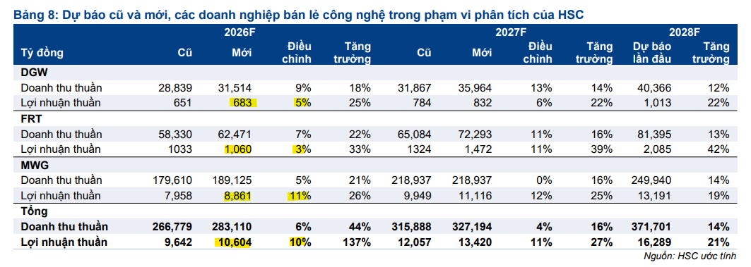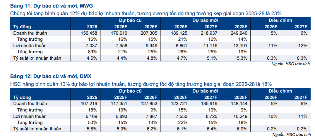 HSC điều chỉnh tăng đáng kể dự báo đối với chuỗi ĐMX và BHX; theo đó, tăng bình quân 5% dự báo doanh thu thuần và tăng bình quân 12% dự báo lợi nhuận thuần của MWG cho các năm 2026-2027. Trong năm 2026, HSC dự báo lợi nhuận thuần đạt 8,861 tỷ đồng (tăng trưởng 26%).