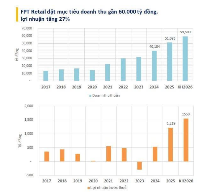 Theo tài liệu Đại hội đồng cổ đông thường niên năm 2026, Công ty Cổ phần Bán lẻ Kỹ thuật số FPT (FPT Retail, mã chứng khoán: FRT) đặt mục tiêu doanh thu thuần đạt 59,500 tỷ đồng. Con số này tương đương mức tăng trưởng 16% so với kết quả thực hiện của năm 2025. Điểm rơi lợi nhuận trước thuế được ban lãnh đạo kỳ vọng ở mức 1,550 tỷ đồng, tăng 27%.