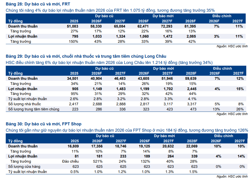 Sau KQKD Q4/2025 tích cực hơn kỳ vọng và triển vọng khả quan của cả mảng dược phẩm và điện máy, HSC điều chỉnh tăng dự báo cho FRT cho các năm 2026-2027. Cho năm 2026, HSC tôi tăng 7% dự báo doanh thu thuần lên 62,471 tỷ đồng (tăng trưởng 22%) và tăng 3% dự báo lợi nhuận thuần lên 1,060 tỷ đồng (tăng trưởng 33%).