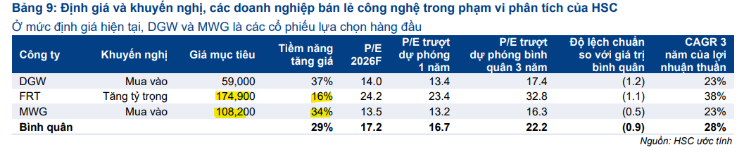 HSC xác định MWG và DGW là những lựa chọn cổ phiếu hàng đầu trong ngành bán lẻ công nghệ cho năm 2026 dựa trên tiềm năng tăng giá lần lượt là 34% và 37%. Mặc dù FRT vẫn giao dịch ở mức định giá cao hơn so với bình quân ngành, nhưng triển vọng bùng nổ của mảng dược phẩm và tiêm chủng vẫn giữ cho cổ phiếu này sức hấp dẫn riêng biệt đối với các nhà đầu tư tổ chức.