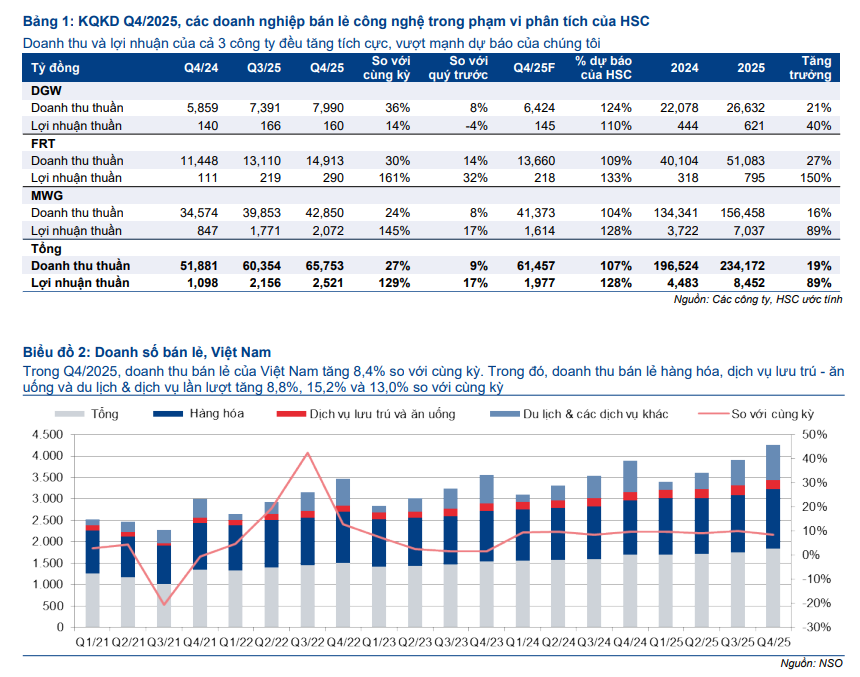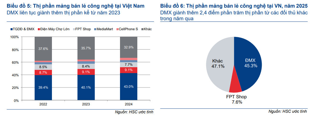 HSC cho rằng các nhà bán lẻ quy mô lớn như MWG, DGW và FRT có vị thế thuận lợi nhất để nắm bắt đà tăng trưởng này nhờ lợi thế về hệ sinh thái sản phẩm dịch vụ mạnh mẽ, trong khi việc siết chặt quản lý thuế từ phía cơ quan nhà nước đang dần loại bỏ lợi thế về giá của các cửa hàng nhỏ lẻ và hàng xách tay.