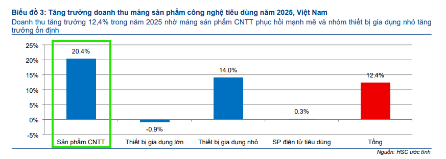 HSC kỳ vọng xu hướng tăng trưởng của ngành hàng công nghệ tiêu dùng sẽ tiếp tục trong năm 2026, với mức tăng trưởng thị trường dự báo đạt 12.2%, chủ yếu được hỗ trợ bởi sự phục hồi của nhu cầu CNTT-TT.