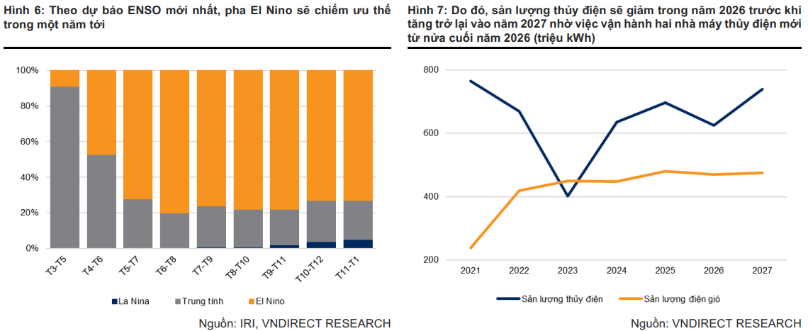Ngược lại, mảng phát điện, đặc biệt là thủy điện, được dự báo sẽ suy giảm trong năm 2026 khi hiện tượng El Nino quay trở lại. Sản lượng điện có thể giảm khoảng 10% so với mức nền cao của năm 2025.