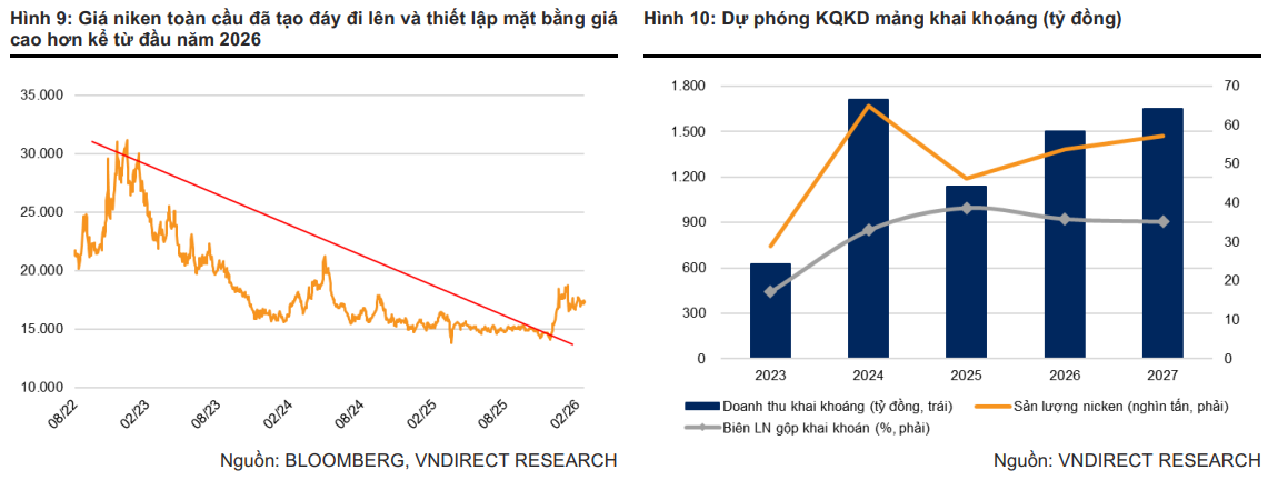 Song song với mảng xây lắp, khai khoáng đang nổi lên như một động lực tăng trưởng quan trọng. Giá nickel đã phục hồi lên vùng 17,000-18,000 USD/tấn, cao hơn đáng kể so với năm trước, nhờ nguồn cung bị siết chặt từ Indonesia.
