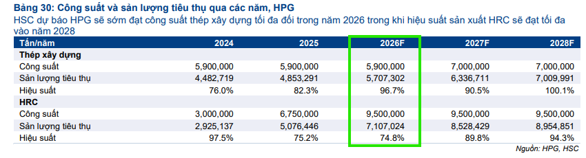 HSC dự báo sản lượng tiêu thụ toàn ngành năm 2026 sẽ tăng trưởng 13.6%, trong đó Tập đoàn Hòa Phát (HPG) là thực thể hưởng lợi lớn nhất nhờ việc đưa vào vận hành dự án Dung Quất 2 đúng thời điểm nhu cầu hạ tầng bùng nổ.