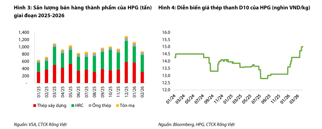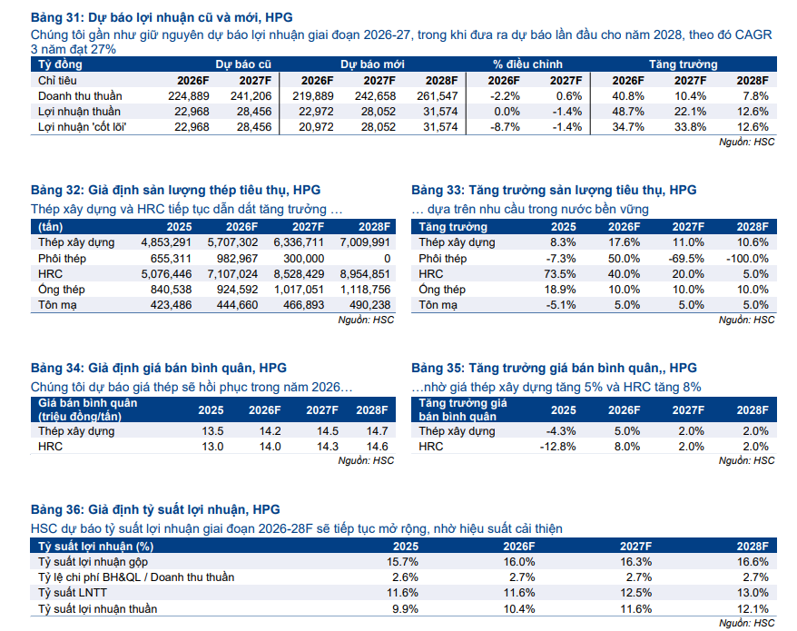 MBS Research duy trì quan điểm tích cực nhưng thận trọng hơn khi dự báo lợi nhuận ròng quý 1/2026 của HPG đạt 3,800 tỷ đồng, tương ứng với mức tăng trưởng 14% so với cùng kỳ. Động lực tăng trưởng chính theo MBS đến từ việc tổng sản lượng tiêu thụ dự kiến tăng khoảng 20%, trong đó sản lượng thép cuộn cán nóng (HRC) bứt phá 50% nhờ sự vận hành hiệu quả của nhà máy Dung Quất 2. MBS đánh giá Hòa Phát đang ở giai đoạn đầu của một chu kỳ tăng trưởng mới khi nhu cầu nội địa phục hồi mạnh mẽ từ làn sóng đầu tư công và xây dựng dân dụng, giúp biên lợi nhuận gộp duy trì ổn định ở mức 14.2% bất chấp các áp lực về chi phí khấu hao.