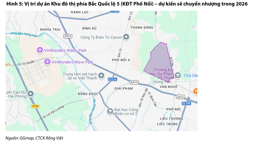 Cụ thể, thị trường đang kỳ vọng doanh nghiệp sẽ hoàn tất việc chuyển nhượng dự án Khu đô thị phía Bắc Quốc lộ 5 (KĐT Phố Nối) trong năm 2026, dự kiến mang về khoản doanh thu tài chính từ 1,000 đến 2,000 tỷ đồng.