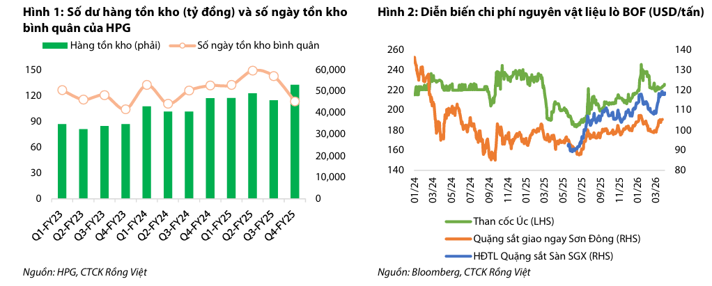 Trái ngược với sự lạc quan của VDSC, VCBS đưa ra dự báo có phần thận trọng khi ước tính lợi nhuận sau thuế của HPG trong quý 1/2026 đạt 3,257 tỷ đồng, giảm nhẹ 2.6% so với mức nền cao của cùng kỳ năm ngoái. Dù sản lượng bán hàng dự báo vẫn tăng trưởng tốt đạt 3.16 triệu tấn (+18,8% YoY), nhưng VCBS lo ngại rằng biên lợi nhuận gộp sẽ chịu áp lực do giá các nguyên liệu đầu vào tăng mạnh trong thời gian gần đây, tiêu biểu như than luyện cốc tăng 12% và quặng sắt tăng 2% so với quý trước. Tuy nhiên, VCBS vẫn đánh giá HPG là lựa chọn ưu tiên hàng đầu nhờ vị thế thượng nguồn và khả năng làm chủ chuỗi cung ứng trong bối cảnh địa chính trị thế giới phức tạp.