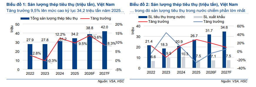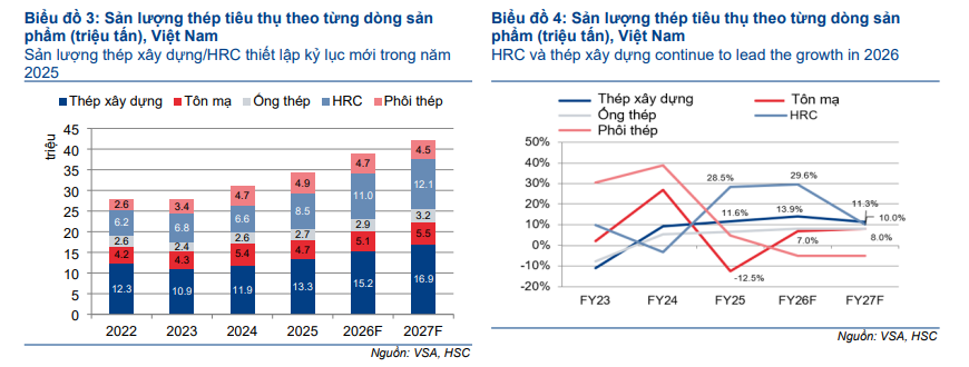 HSC dự báo sản lượng tiêu thụ thép năm 2026 sẽ tăng trưởng 13.6%, đạt 38.8 triệu tấn, nhờ mức tăng trưởng lần lượt 13.9% và 28.5% của thép xây dựng và HRC