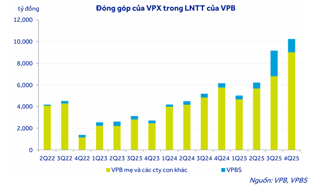 Sự sôi động của thị trường chứng khoán trong năm 2025 và quý 1 năm 2026 đã tạo ra một bệ phóng hoàn hảo cho các hoạt động của công ty chứng khoán. VPX không chỉ dừng lại ở việc duy trì vị thế trong top 10 thị phần môi giới trên sàn HOSE mà còn đang chuyển mình mạnh mẽ thành một ngân hàng đầu tư đa năng. Trong cơ cấu thu nhập của ngân hàng mẹ, đóng góp lợi nhuận từ mảng chứng khoán đã tăng lên mức khoảng 12% tổng lợi nhuận trước thuế vào cuối năm 2025, phản ánh sự thay đổi quan trọng trong chiến lược đa dạng hóa nguồn thu của tập đoàn.