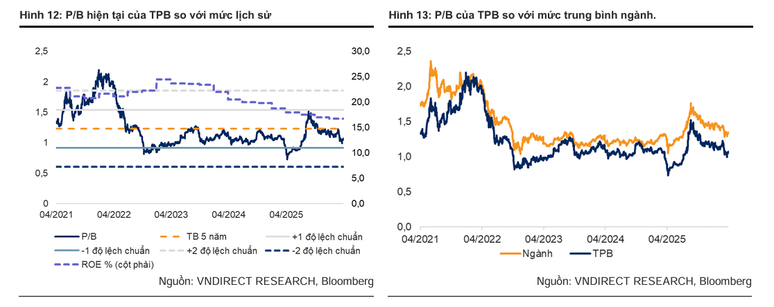 Hiện tại, TPB đang được giao dịch với mức P/B khoảng 1.0 lần, thấp hơn mức trung bình 5 năm là 1.2 lần và thấp hơn mức trung bình ngành là 1.3 lần.