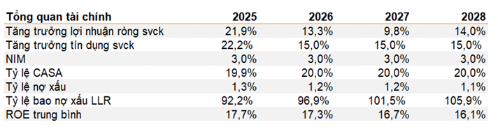 - Kết quả quý 1/2026: Lợi nhuận sau thuế dự báo 2,063–2,138 tỷ đồng (+22–27% YoY), lợi nhuận trước thuế ~2,200 tỷ đồng (-30% QoQ). Thu nhập lãi thuần tăng 16% YoY, chi phí dự phòng 600 tỷ (+19% YoY). NIM duy trì quanh 3.0% nhờ CASA ~23%.