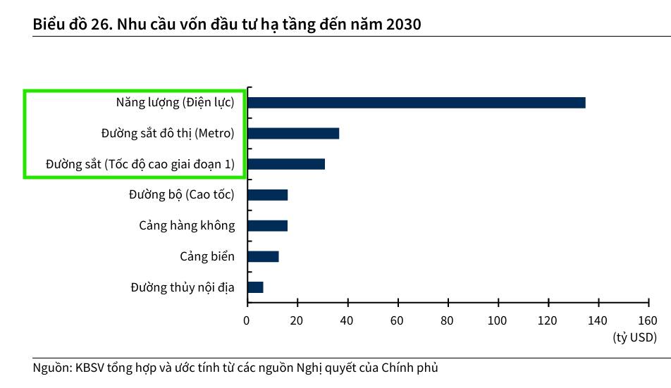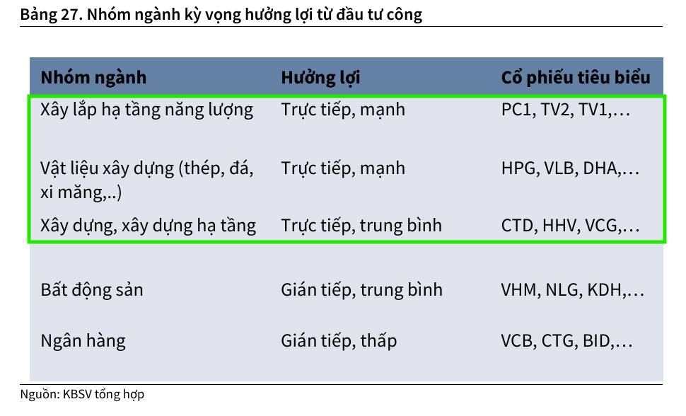 • Lan tỏa tới xây lắp & vật liệu: Vinaconex (VCG), Lizen (LCG), Đèo Cả (HHV) hưởng lợi từ backlog lớn và dòng tiền BOT ổn định. Các dự án như Nút giao Gò Dưa, Cầu Thủ Thiêm 4 hồi sinh, kích cầu tiêu thụ thép và vật liệu, gián tiếp hỗ trợ HPG, HSG. KBSV dự báo ngành xây dựng 2026 tăng trưởng ~10% YoY, nhưng nhấn mạnh sự phân hóa giữa các mã (HHV hấp dẫn, CTD/PC1 dư địa ngắn hạn thu hẹp).