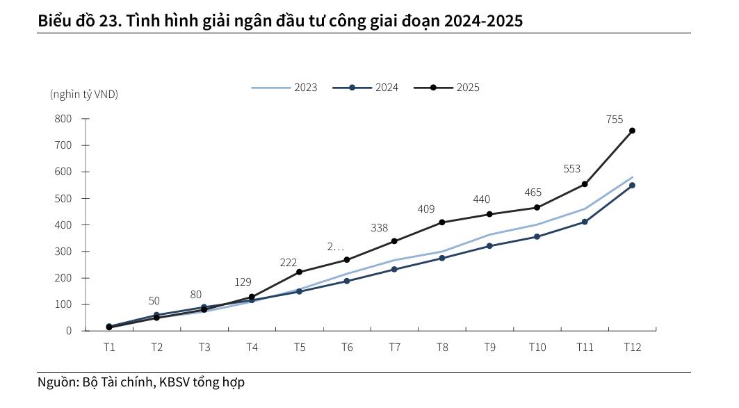 Theo nhận định từ Công ty Chứng khoán KB Việt Nam (KBSV), năm 2026 đánh dấu một cột mốc lịch sử về nguồn lực đầu tư công khi tổng kế hoạch vốn ngân sách nhà nước đã chính thức vượt ngưỡng 1 triệu tỷ đồng. Cụ thể, kế hoạch do Thủ tướng Chính phủ giao đạt 995,348.05 tỷ đồng, tăng khoảng 93 nghìn tỷ đồng so với năm 2025. Nếu tính cả phần vốn ngân sách địa phương giao tăng và vốn kéo dài từ các năm trước, tổng quy mô vốn thực tế đạt khoảng 1,008,610.9 tỷ đồng, tương ứng mức tăng trưởng 10% so với năm trước. Tuy nhiên, trái với kỳ vọng về một cú bứt tốc ngay từ đầu năm, tiến độ giải ngân trong 2 tháng đầu năm 2026 vẫn còn tương đối chậm khi tỷ lệ thực hiện mới chỉ đạt 5.6% kế hoạch. Đáng lưu ý là nguồn vốn ngân sách Trung ương — vốn mang tính dẫn dắt các dự án hạ tầng trọng điểm — chỉ mới đạt 2.9%, cho thấy sự gia tăng về con số giải ngân tuyệt đối chủ yếu đến từ việc mở rộng quy mô vốn tổng thể chứ chưa phải sự bứt phá trong hiệu suất triển khai.