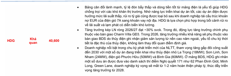 Nhìn rộng ra cả năm 2026, HDG được đánh giá là lựa chọn phù hợp nhờ bảng cân đối lành mạnh và dòng tiền tốt từ các nhà máy điện hiện hữu, giúp doanh nghiệp đứng vững trước rủi ro lãi suất.