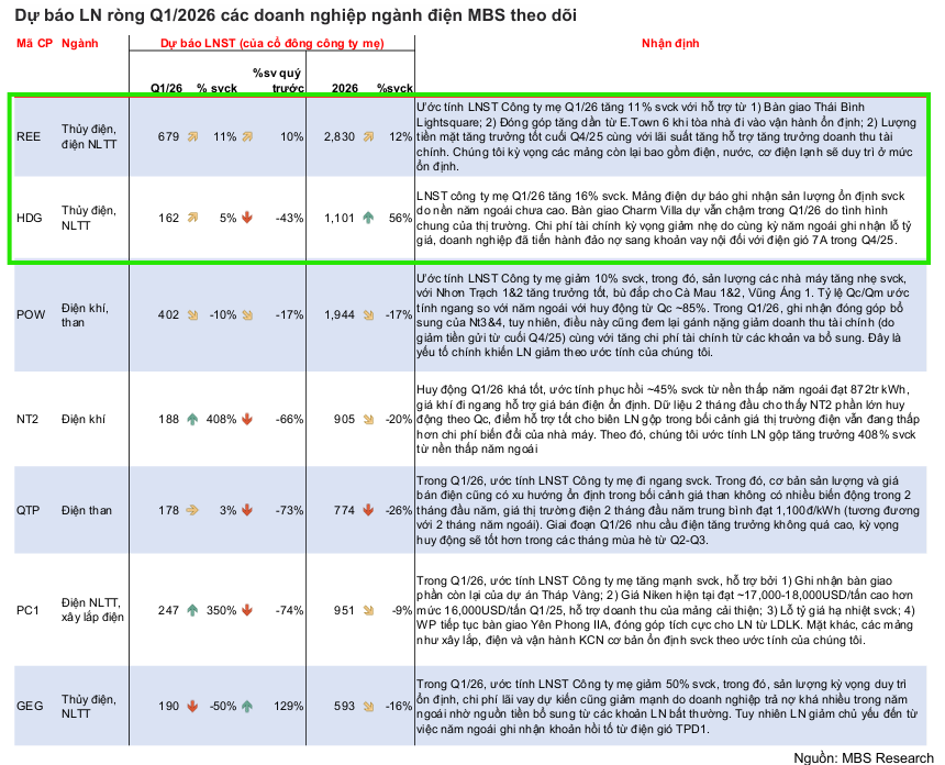 - REE: Lợi nhuận sau thuế quý 1/2026 dự kiến 679 tỷ đồng (+11% YoY). Động lực từ bàn giao dự án Light Square Thái Bình, E-town 6 và nguồn thu tài chính lớn. Mảng thủy điện có thể chịu tác động El Niño, nhưng REE mở rộng mạnh điện gió (Duyên Hải V1-4, nghiên cứu điện gió ngoài khơi Nam Bộ 3 – quy mô 500 MW).