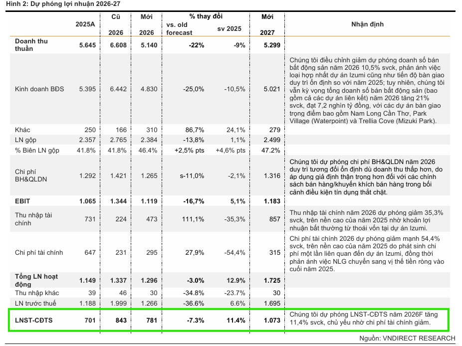 VNDirect dự báo doanh thu năm 2026 có thể giảm nhẹ khoảng 8.9% do việc loại hợp nhất dự án Izumi City, nhưng lợi nhuận sau thuế của cổ đông công ty mẹ dự kiến vẫn tăng trưởng 11.4%, đạt 781 tỷ, nhờ chi phí tài chính giảm mạnh.