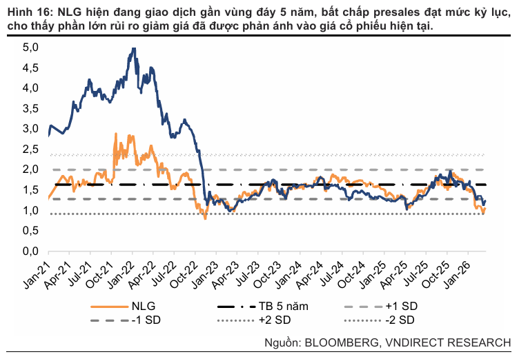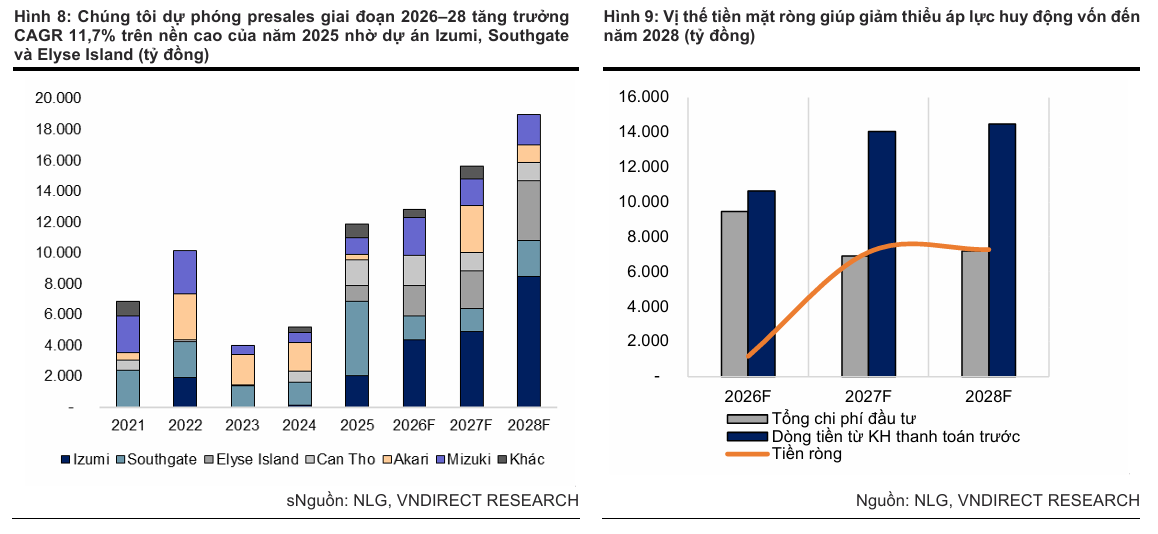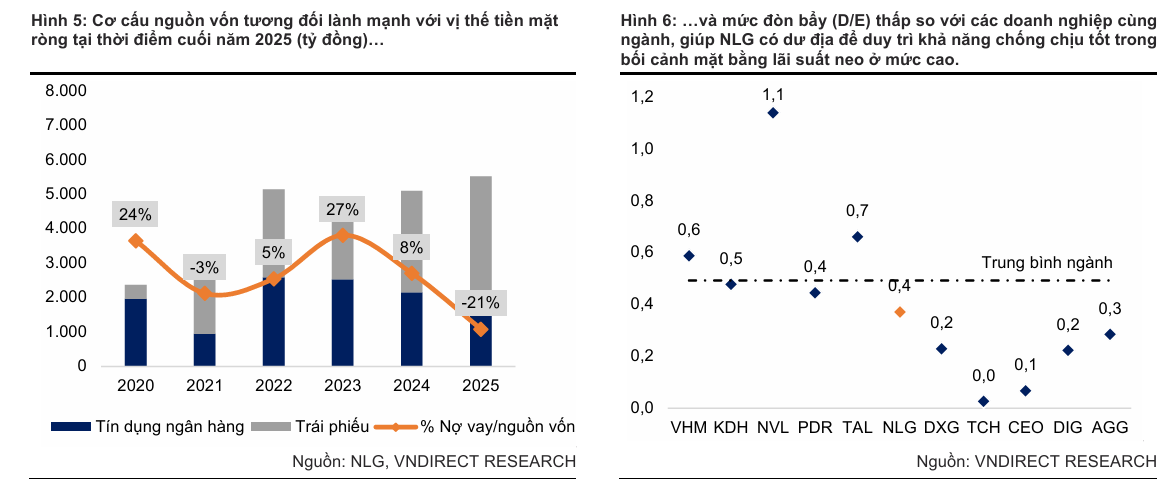 - Năng lực tài chính & presales: NLG đã chuyển sang trạng thái tiền mặt ròng, tỷ lệ nợ vay ròng/VCSH -21% cuối 2025. Doanh số ký bán (presales) năm 2025 đạt kỷ lục 11,900 tỷ đồng (+128% YoY); 2 tháng đầu 2026 tiếp tục ghi nhận 1,200 tỷ đồng, bất chấp lãi suất vay tăng.