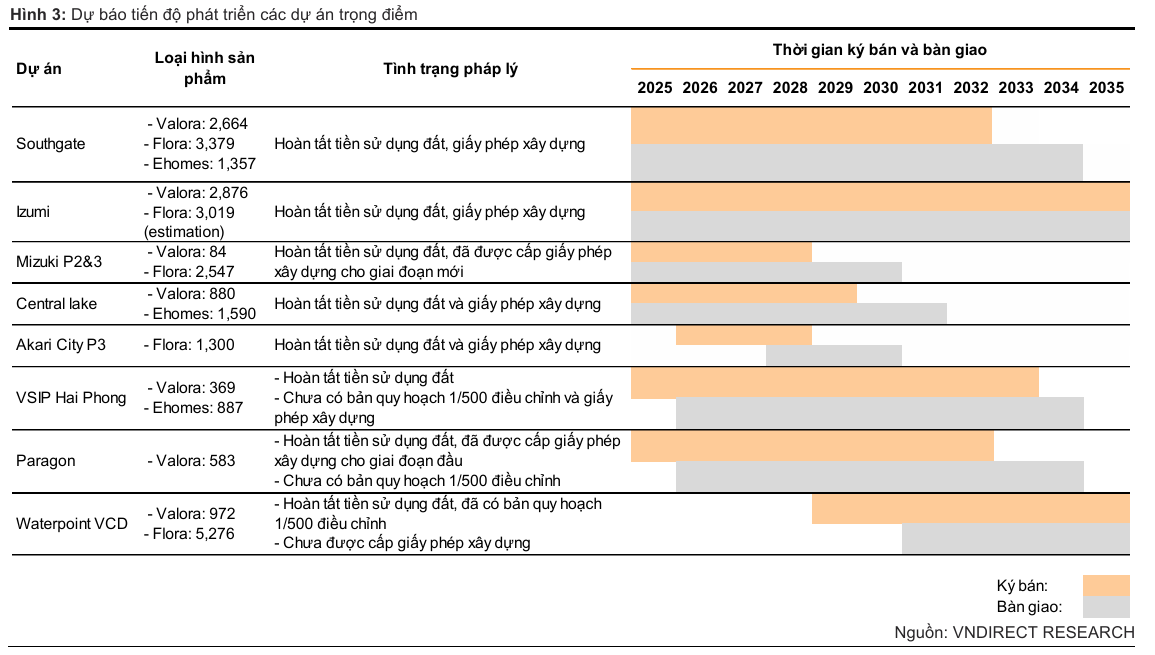 Kết quả & kế hoạch 2026: VNDirect dự báo doanh thu năm 2026 giảm nhẹ -8.9% do loại hợp nhất Izumi City, nhưng lợi nhuận sau thuế cổ đông công ty mẹ vẫn tăng +11.4%, đạt 781 tỷ đồng nhờ chi phí tài chính giảm. Backlog hợp đồng chưa ghi nhận cuối 2025 đạt 10,900 tỷ đồng, đảm bảo lợi nhuận rõ ràng cho giai đoạn 2027–2028.