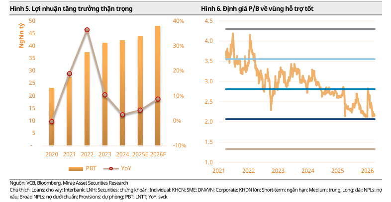 Bước sang năm 2026, Vietcombank đặt mục tiêu tăng trưởng lợi nhuận mạnh mẽ hơn sau giai đoạn tích lũy và chuyển đổi trong hai năm trước đó. Hầu hết các CTCK đều đồng thuận rằng năm 2026 sẽ đánh dấu sự quay trở lại của mức tăng trưởng lợi nhuận hai chữ số cho ngân hàng này.