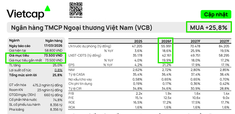 Kết thúc quý 1 năm 2026, các CTCK lớn đều đưa ra những dự báo tích cực về kết quả kinh doanh của Vietcombank, mặc dù có sự phân hóa nhất định về tốc độ tăng trưởng so với các ngân hàng thương mại cổ phần tư nhân.