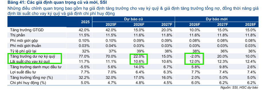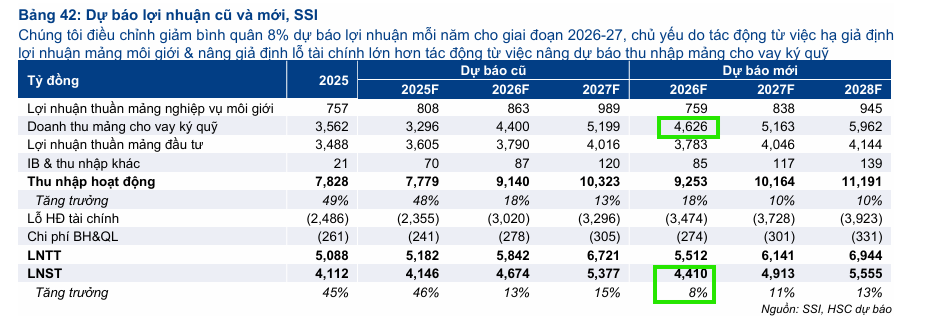 HSC dự báo dư nợ cho vay ký quỹ của công ty có thể giảm nhẹ 2% trong năm 2026 trước khi phục hồi vào các năm tiếp theo. Để bù đắp cho chi phí huy động vốn dự kiến tăng từ 5% lên 6%, SSI sẽ thực hiện lộ trình nâng lãi suất cho vay ký quỹ lên mức 12% – 12.2%.
