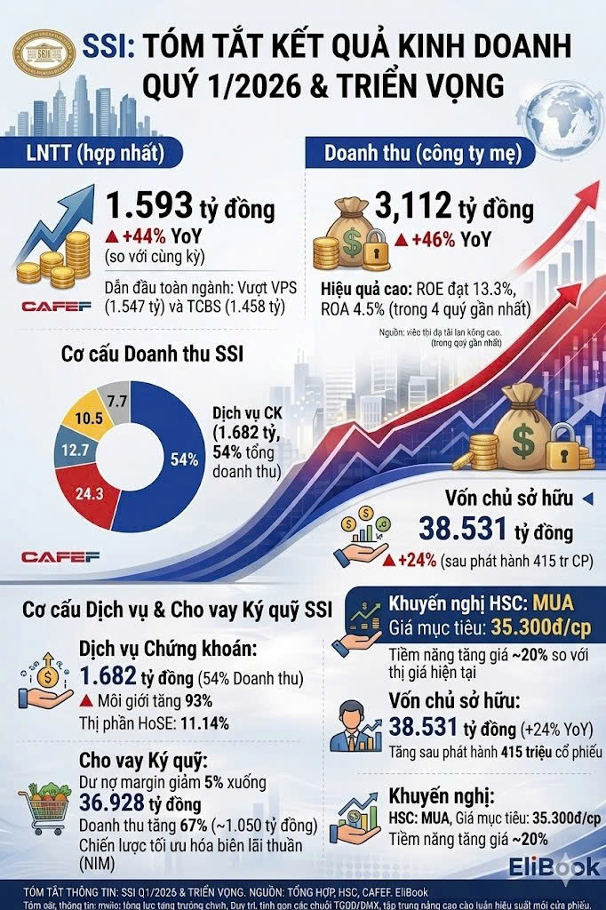 • Kết quả kinh doanh Q1/2026: SSI ghi nhận lợi nhuận trước thuế hợp nhất 1,593 tỷ đồng (+44% YoY), dẫn đầu toàn ngành, vượt VPS (1,547 tỷ) và TCBS (1,458 tỷ). Doanh thu công ty mẹ đạt 3,112 tỷ đồng, tăng 46% YoY. ROE đạt 13.3%, ROA 4.5% trong 4 quý gần nhất.
