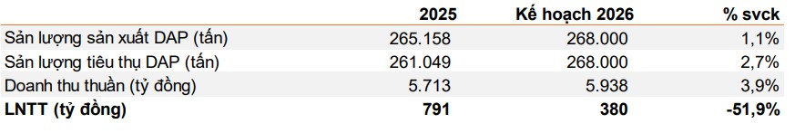 Doanh nghiệp đặt mục tiêu doanh thu thuần đạt 5,938 tỷ đồng, tăng trưởng 3.9% so với thực hiện năm 2025 trên cơ sở sản lượng tiêu thụ DAP dự kiến đạt 268,000 tấn (+2.7% yoy).