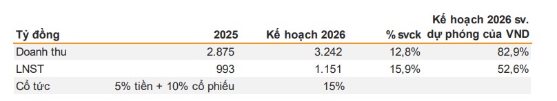 • Kế hoạch kinh doanh 2026: Hà Đô đặt mục tiêu doanh thu 3,242 tỷ đồng (+13% yoy) và lợi nhuận sau thuế 1,151 tỷ đồng (+16% yoy). MBS dự phóng LNST đạt 1,101 tỷ đồng (+56%), trong khi Vietcap thận trọng hơn với 860 tỷ đồng (+22%).