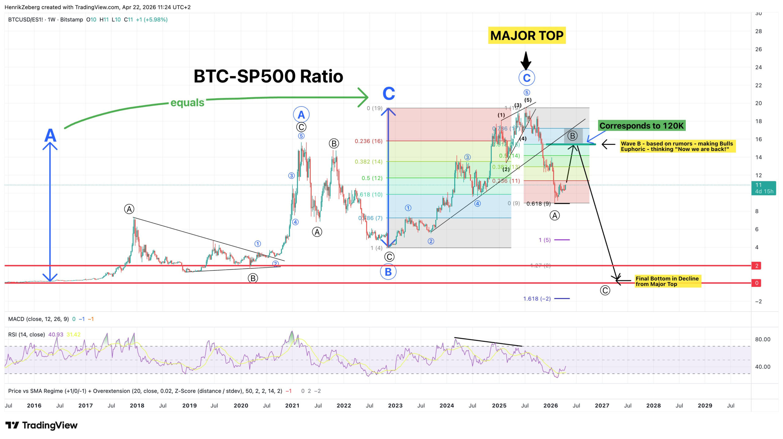 Biểu đồ tỷ lệ là mỏ neo liên tài sản đầu tiên. Nó cho chúng ta biết BTC nên giao dịch ở đâu khi SPX hoàn tất cấu trúc của nó. Bây giờ chúng ta chuyển sang bản thân Bitcoin để xem liệu biểu đồ trực tiếp có độc lập đồng ý hay không.