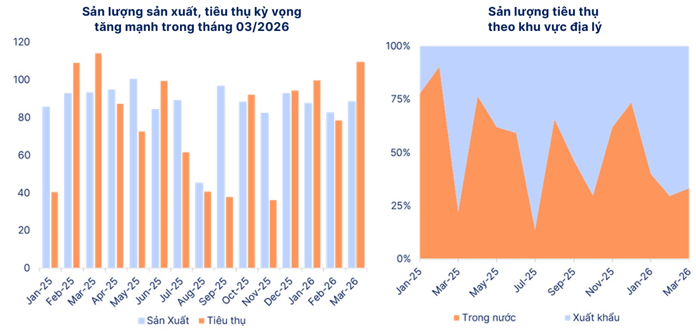 Thực tế, xuất khẩu Ure của DCM 3 tháng đầu năm tăng mạnh (giai đoạn thấp điểm của mùa vụ trong nước), đạt hơn 177 nghìn tấn (+73% YoY), chiếm hơn 40% tổng sản lượng tiêu thụ. Ở chiều ngược lại, tiêu thụ trong nước giảm nhẹ, chỉ đạt hơn 94 nghìn tấn, -34%YoY.
