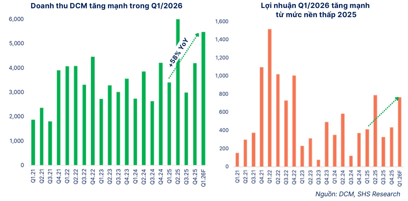 Quý 1/2026, DCM đạt lợi nhuận trước thuế 837–878 tỷ đồng, tăng trưởng 93–184% yoy, hoàn thành tới 67% kế hoạch năm chỉ sau một quý nhờ tận dụng kho hàng tồn giá rẻ (~4,800 tỷ đồng).