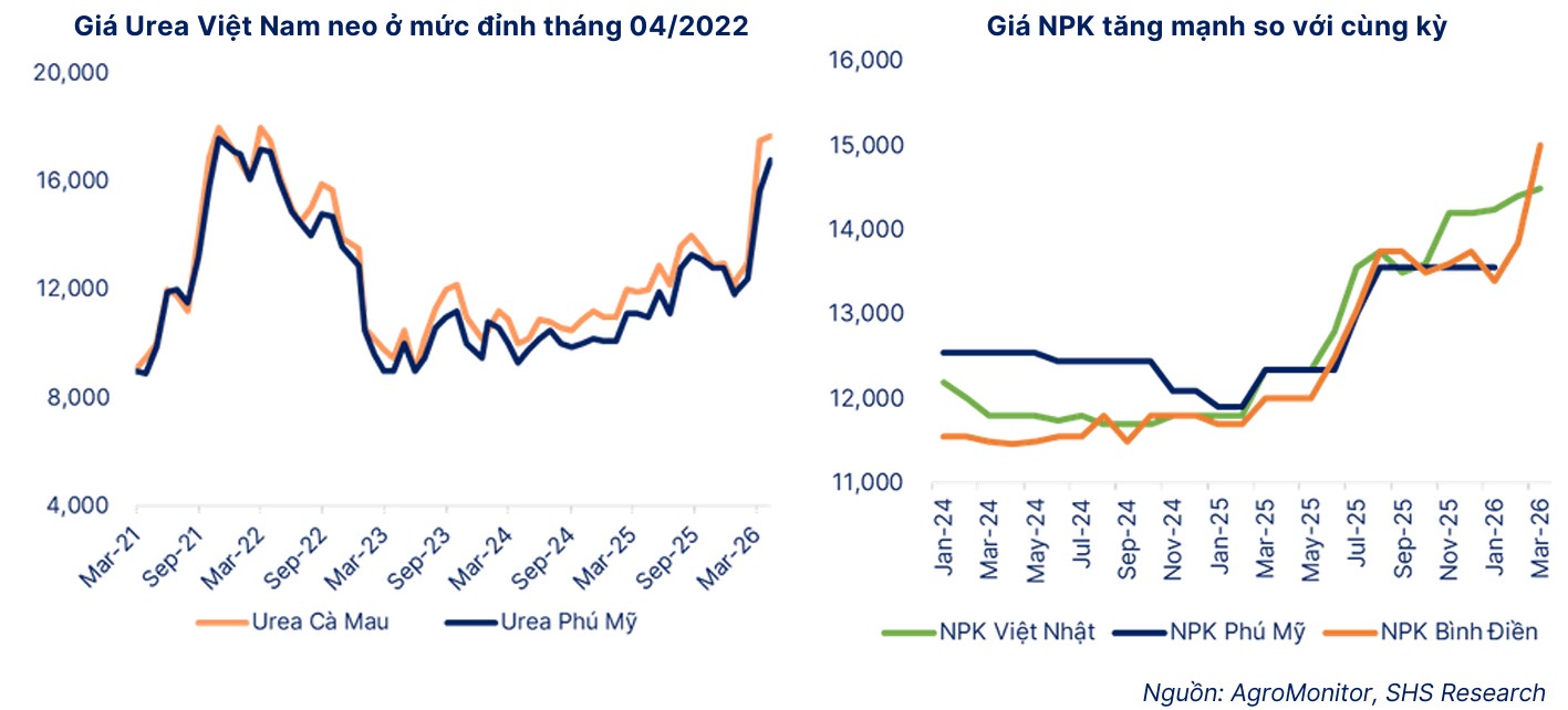 4 tháng đầu năm 2026, giá Ure Cà Mau tăng mạnh so với cùng kỳ, ước tính trung bình đạt 15,140 VND/kg (+29% YoY, cuối tháng 04/2026 Urea Cà Mau đang giao dịch ở mức 17,700 VND/kg, +61% Ytd). Ngoài ra giá các loại phân khác cũng tăng mạnh: DAP +50% Ytd, Kali +40% Ytd…Việc giá Ure neo có thể ảnh hưởng tới nhu cầu trong nước và do đó, doanh nghiệp sẽ đẩy mạnh xuất khẩu.