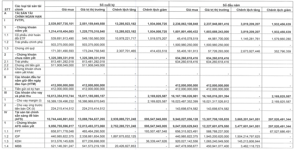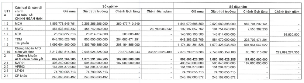 Danh mục AFS của Vietcap ghi nhận giá trị hợp lý 12,013 tỷ đồng, giảm nhẹ so với đầu năm. Dù các khoản đầu tư vào FPT và MWG tạm lỗ lần lượt 193 tỷ và 27 tỷ đồng, Vietcap vẫn thu lời lớn từ MCH (lãi 350 tỷ) và TDM (lãi hơn 200 tỷ), bên cạnh sự ổn định từ khoản đầu tư chiến lược IDP.