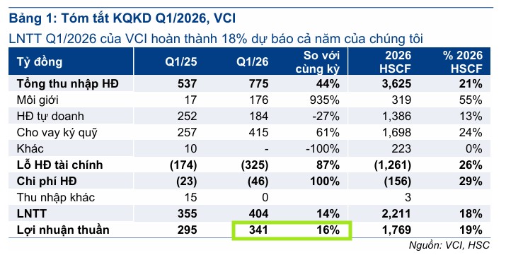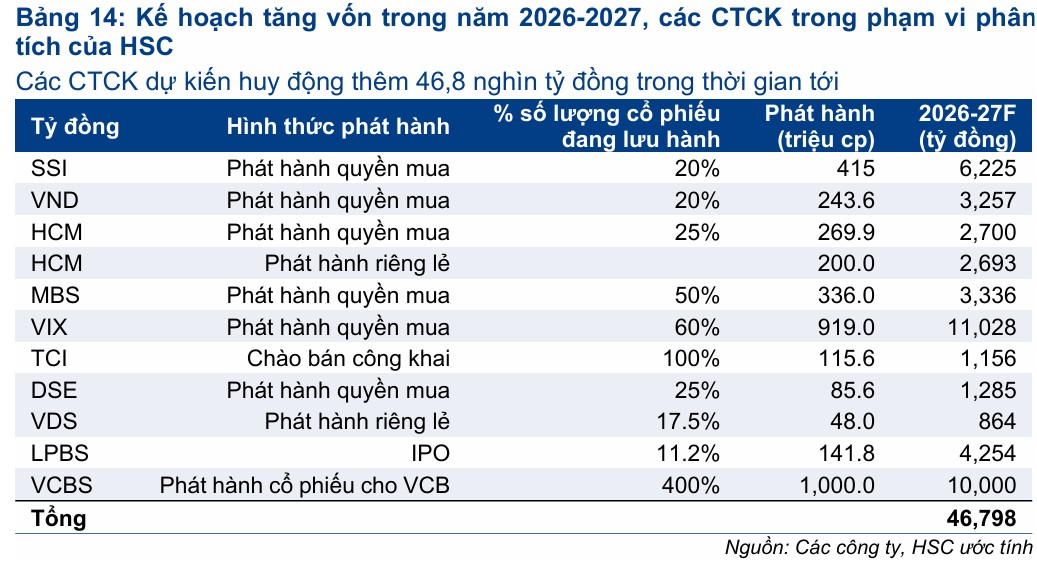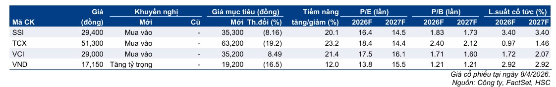 HSC (HCM) chuyển hướng chiến lược, rút gần 4,000 tỷ đồng tự doanh để tập trung margin và trái phiếu, đặt mục tiêu lợi nhuận trước thuế 2,302 tỷ đồng (+56% YoY); VPBankS (VPX) tăng trưởng doanh thu 126%, dư nợ margin 36,300 tỷ đồng (+181% YoY), đặt kế hoạch lợi nhuận năm 6,453 tỷ đồng
