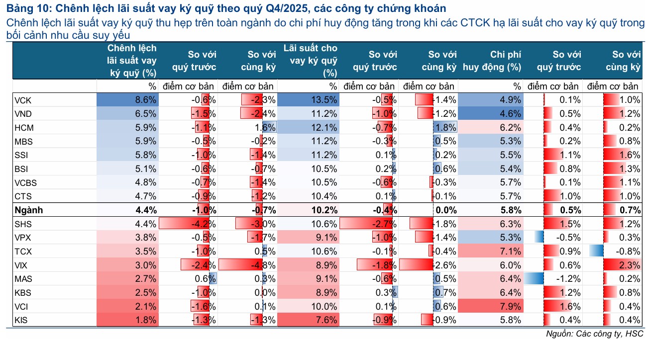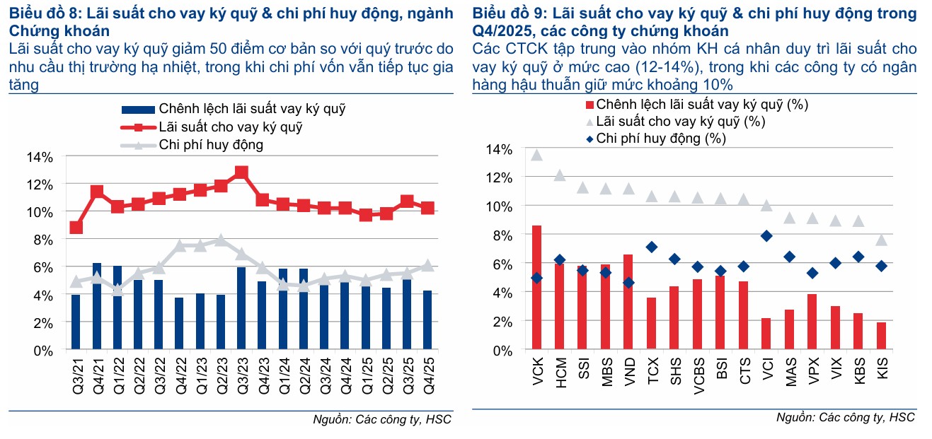 Lãi suất cho vay ký quỹ Q4/2025 giảm 40 điểm cơ bản xuống 10.2%, trong khi chi phí huy động tăng 60 điểm cơ bản lên 6.1%, thu hẹp chênh lệch xuống 4.2% từ 5.2% trong Q3/2025.