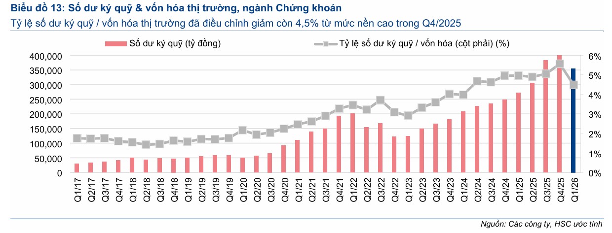 Tỷ lệ đòn bẩy thị trường (tỷ lệ dư nợ cho vay ký quỹ/tổng vốn hóa thị trường) đã giảm xuống 4.5% từ mức 5.5% trong Q4/2025 và khoảng 5% trong các quý trước đó, điều này cũng cho thấy bối cảnh rủi ro thấp hơn.