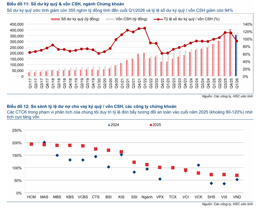 Tỷ lệ dư nợ cho vay ký quỹ/vốn CSH ước tính đã giảm xuống 94% tại thời điểm cuối Q1/2026, thấp hơn nhiều so với mức 116% tại thời điểm cuối Q4/2025 và 99% tại thời điểm cuối Q1/2025.