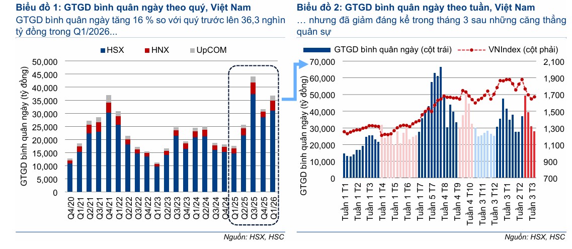 Ngành chứng khoán Việt Nam quý 1/2026 ghi nhận thanh khoản bình quân 35,004 tỷ đồng/phiên (+20% YoY), nhưng dư nợ margin giảm 12% xuống 355 nghìn tỷ đồng, đưa tỷ lệ đòn bẩy về mức an toàn hơn (94% vốn CSH, so với 116% cuối 2025).