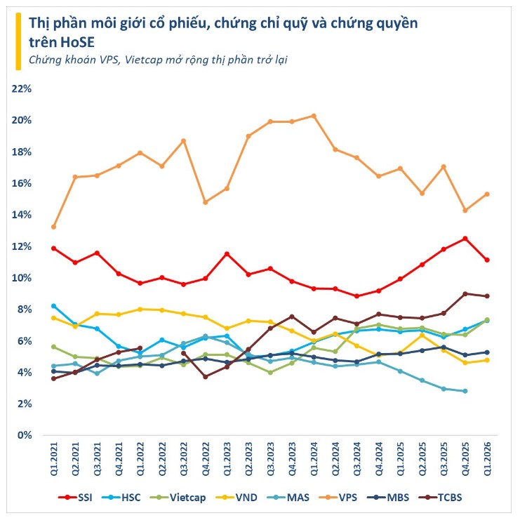 Bức tranh thị phần môi giới quý 1 có sự xáo trộn nhẹ. Cụ thể, trong quý đầu năm, Chứng khoán VPS tiếp tục đứng đầu thị phần môi giới trên HoSE với tỷ lệ 15.32%, tăng nhẹ so với mức 14.28% của quý 4 năm trước. Khoảng cách với nhóm bám đuổi theo đó được nới rộng trở lại, sau giai đoạn thu hẹp trước đó.