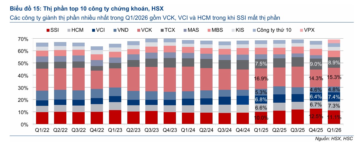 Đứng thứ hai vẫn là CTCP Chứng khoán SSI với 11.14%. Trong khi đó, CTCP Chứng khoán Kỹ Thương (TCBS) giữ vị trí thứ ba với 8.85%, cũng giảm nhẹ so với mức 9% của quý 4/2025.