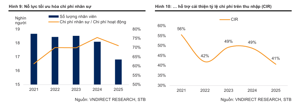 Tại thời điểm cuối năm 2025, tỷ lệ CIR của ngân hàng ở mức khoảng 40.7%, đã cải thiện đáng kể so với mức gần 49% của năm 2024. Việc đạt được mục tiêu này sẽ giúp Sacombank lọt vào top 3 ngân hàng có hiệu quả chi phí tốt nhất hệ thống, từ đó gia tăng đáng kể năng lực sinh lời ròng.