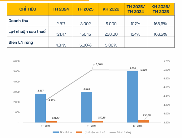 Tại kỳ đại hội này, các cổ đông đã thông qua kế hoạch kinh doanh đầy tham vọng với mục tiêu doanh thu thuần đạt 5,000 tỷ đồng và lợi nhuận sau thuế đạt 250 tỷ đồng, cùng ghi nhận mức tăng trưởng 67% so với kết quả thực hiện của năm 2025.