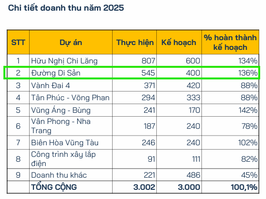 Hai động lực chính đóng góp vào nguồn thu xây lắp bao gồm dự án đường Di sản Hưng Yên với doanh thu mục tiêu khoảng 1,140 tỷ đồng và dự án mở rộng cao tốc Nội Bài – Lào Cai (đoạn Yên Bái – Lào Cai) đóng góp khoảng 1,400 tỷ đồng.